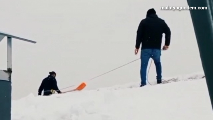 Malatya'da iki kişinin, 14 katlı bir apartmanın çatısındaki tehlikeli kar temizliği cep telefonu kamerasına yansıdı.