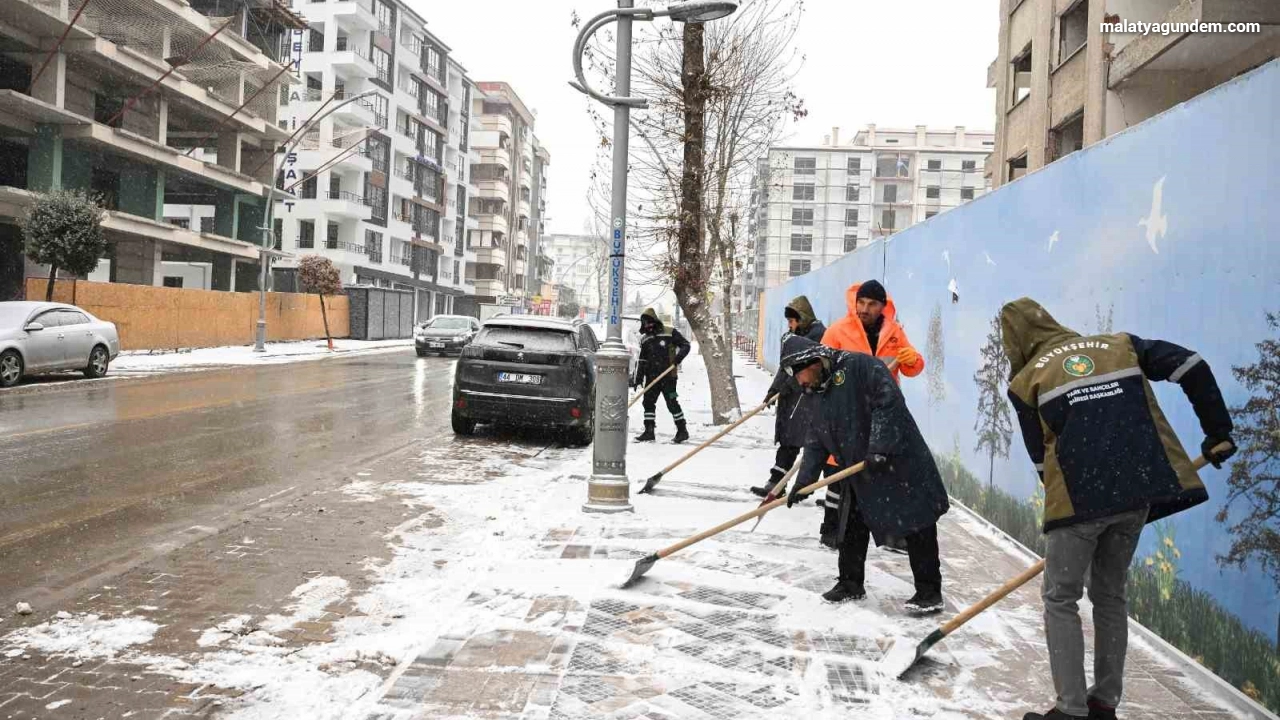 Kar yağışının yoğun olarak görüldüğü bölgelerde kar küreme ve buzlanmaya karşı çalışmalarını aksatmaksızın sürdüren Büyükşehir Belediyesi ekipleri, Malatya merkezde kar yağışı nedeniyle kaldırımlarda temizleme, buzlanmaya karşı solüsyonlama ve tuzlama çalışmalarına aralıksız devam ediyor.