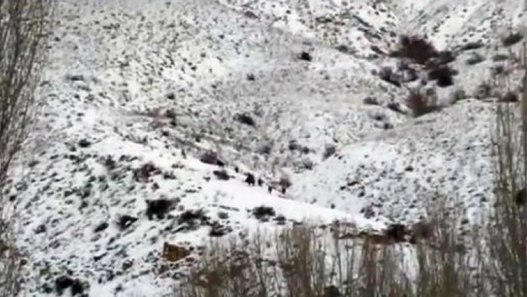 Daren’nin Beybağı Mahallesi dağlık kısmında yaşayan yaban domuzları, kar nedeniyle yiyecek bulamayınca sürüler halinde yerleşim yerlerine indi. Bölgede yiyecek arayan domuzlar, bir vatandaş tarafından cep telefonuyla görüntüledi.