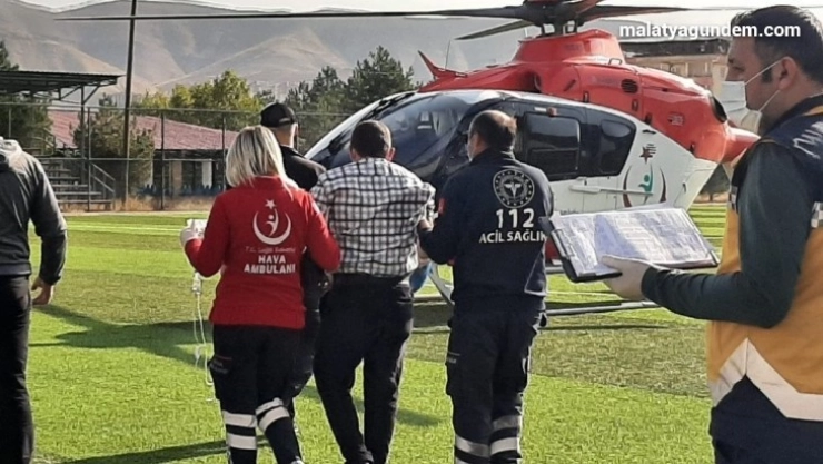 Malatya'nın Darende ilçesinde parmağını kıyma makinesine kaptıran hasta ile yüksek tansiyon hastası kadının imdadına 112 hava ambulansı yetişti.
