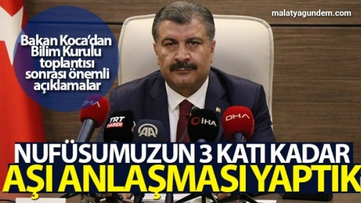 Sağlık Bakanı Koca, 'Şu anda Türkiye 100 milyon doz sinovac ile, 90 milyon doz Biontech ile ve 50 milyon doz da Sputnik ile anlaşma imzalamış durumdadır. Yaklaşık nüfusumuzun 3 katı kadarlık doz aşı için anlaşmalar imzalanmıştır. ' dedi.