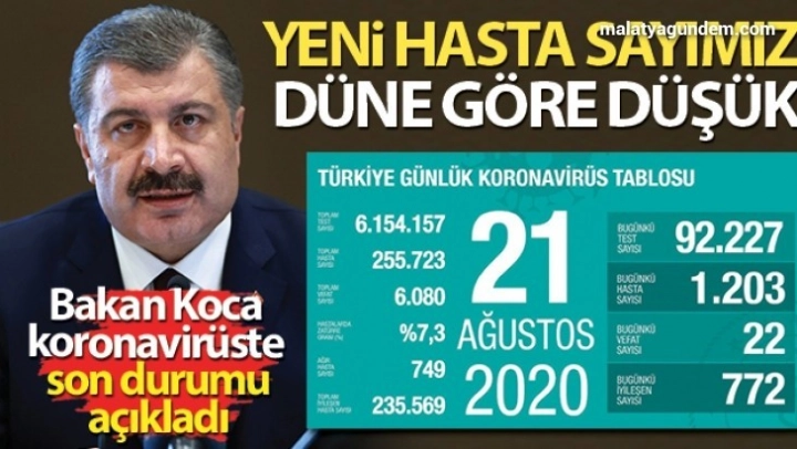 Sağlık Bakanı Fahrettin Koca, sosyal medya hesabından Türkiye'nin güncel korona virüs tablosunu kamuoyu ile paylaştı. Tabloya göre son 24 saatte 22 kişi korona virüsten hayatını kaybetti, toplam can kaybı 6 bin 80'e yükseldi. Bugün toplam 92 bin 227 test yapılırken, bin 203 yeni vaka tanısı konuldu.