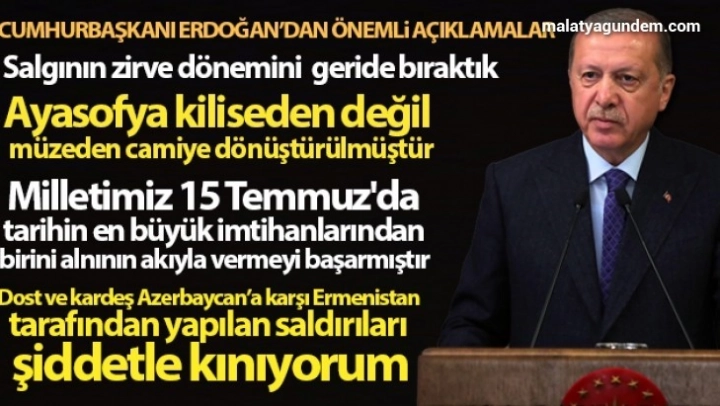Cumhurbaşkanı Erdoğan kabine toplantısı sonrası önemli açıklamalarda bulundu. Erdoğan, ''Ayasofya, kiliseden değil müzeden camiye dönüştürülmüştür. Harap halde teslim alınan Ayasofya, tam anlamıyla bize ait bir eser haline dönüştürülmüştür'' dedi.
