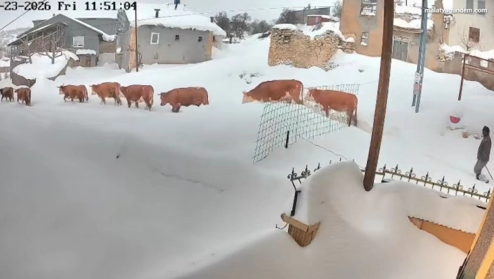 Malatya'da etkili olan yoğun kar yağışı, kırsal bölgelerde hayatı olumsuz etkilerken, kentte büyükbaş hayvanların yoğun karda ilerleyişi kameralar tarafından kaydedildi.