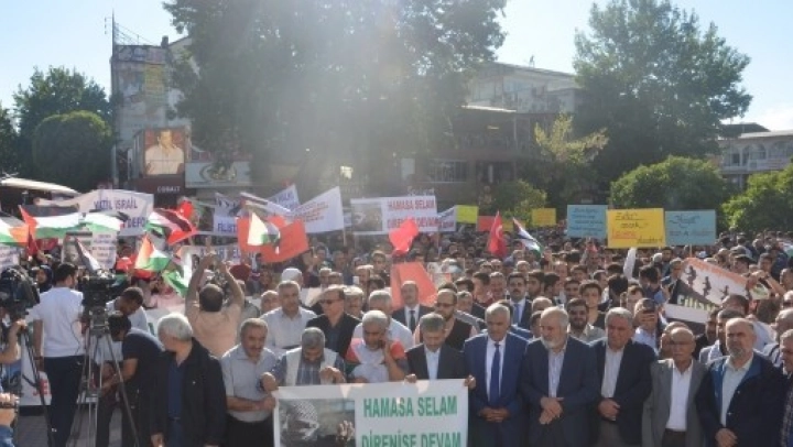 ABD'nin Tel Aviv'deki Amerikan büyükelçiliğini Kudüs'e taşımasını protesto eden Filistinli göstericilere silahlı müdahalede bulunan ve aralarında çocukların da bulunduğu en az 60 kişiyi öldüren 3 bine yakın insanı da yaralayan terör devleti İsrail'e tepkiler dinmiyor. Malatya'da Ortak Değerler Platformu adı altında birleşen yüzlerce Sivil Toplum Kuruluşu ve temsilcileri Soykan Meydanında eylem yaparak İsrail ve Amerika'ya tepki gösterdi. On binlerce vatandaşın da destek verdiği eylemde ABD ve İsrail bayraklarını yakan vatandaşlar terör devleti İsrail'e kin kustu. Sloganlar atarak İsrail ve Amerika'yı lanetleyen Malatyalılar daha sonra Filistin'de şehit olanlar için gıyabi cenaze namazı kıldı. Namaz sonrası bir açıklama yapan Ortak Değerler Platformu Basın Sözcüsü Hüseyin Polat, yaklaşık iki aydır, Filistinlilerin, yıllardır sürgündeki diğer Filistinlilerin dönüşünü sembolize eden, Büyük Dönüş Yürüyüşü adı altında sürdürdükleri ve hiçbir şiddet içermeyen, tamamen barışçıl eylemin kana bulandığını söyledi. Yürüyüşün başladığı günden bu yana, 200'ün üzerinde insanın, terörist devletin askerlerinin kullandığı canlı mermilerle katledildiğini belirten Polat, 'Evet, 70 yıldır Filistinli kardeşlerimiz, insanlıktan nasibi olmayan, insanlığın yüz karası bu terör devletinin uyguladığı onca zulümlere karşı mücadele ediyor, direniyor ve her gün kurbanlar veriyorlar. Çağdaş, emperyalist güçler ise, yıllardır işlenen bu zulümleri bir tiyatro izler gibi izlediler. Televizyon ekranlarında kınadıklarını iddia ettikleri insanlık düşmanı, işgalci, terör aygıtını, tavır ve tutumlarıyla cesaretlendirdiler, destek verdiler, hatta teşvik ettiler. Bundan beş ay önce, İslam Dünyasının dağınıklığını fırsat bilen Amerika, Müslümanların başına musallat ettiği kralları, şeyhleri, veliahtları ve darbeci başkanlarından da cesaret alarak ilk kıblemizi, miracın ve İsrnın topraklarını terör merkezinin başkenti olarak ilan ederek, İslam ümmetine açıkça savaş ilan etti. Başa geldiği günden beri bir kovboy gibi hareket eden Trump, İsrail'den daha İsrailci olmaya çalışarak, bu güne kadar, barış adına ortaya konulduğu iddia edilen tüm çaba ve gayretleri bir anda yok ederek, savaşın fitilini ateşledi' dedi. Polat, Filistinlilerin er ya da geç özgürlüğüne kavuşacağını ifade ederek, 'Biz şu andan itibaren, bütün çalışmalarımızı, emperyalistlerin bağrımıza sapladıkları hançeri çıkarıp atmak için yapacağız. Emperyalistler iyi bilsinler ki, işlenen zulüm, kesinlikle yeni Ömerler, Salahaddinler çıkaracaktır. Hepimizin duası, Allah'ın bizi Salahaddin kılması veya aramızdan Salahaddinler çıkarmasıdır. Bizim sineceğimizi, boyun eğeceğimizi, kabuğumuza çekileceğimizi zannedenler, çok yakın bir zamanda ne kadar yanlış düşündüklerini göreceklerdir. Yaşanan bu vahim olaydan dolayı üç günlük yas ilan ederek, duyarlılığını gösteren ülkemizin idarecilerine bu duyarlılıklarını devam ettirmelerini, bunun yanında emperyalistlerin planlarını uygulamaya çalışan, onların sözcülüğünü yapan veya onlardan öğrendiklerini gevelemeye çalışanlara da şöyle sesleniyoruz. 'Amerika'nın öncülüğünde Siyonist, terör devletiyle yapmış olduğunuz Camd David, Oslo ve benzeri anlaşmaların geçersiz olduğunu ifade edin. Bu terör aygıtıyla yapmış olduğunuz anlaşmalardan çekilin, ülkelerimiz adına onunla kurduğunuz tüm diplomatik ilişkileri kesin. Oradaki elçiliklerimizi kapatın, ümmetin yakasından düşün ve yolumuzdan çekilin. Biliniz ki; şu anda başında bulunduğunuz Müslüman halklar, bu terör devleti ve ona destek verenlerle yaptığınız hiçbir anlaşmayı kabul etmemektedirler. Bu ümmet düşmanlarının amaçlarına hizmet eden, onlarla işbirliği yapan, servetini başkalarına peşkeş çekenleri affetmeyecektir'' diye konuştu.