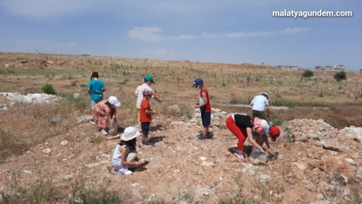 Malatya'da minik öğrenciler, sokakta çöp toplayarak sokak hayvanları için doğaya yiyecek bıraktı.