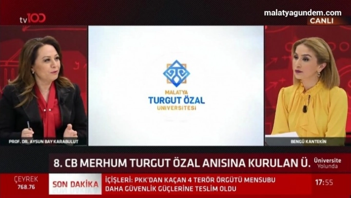 MTÜ Rektörü Prof. Dr. Aysun Bay Karabulut, ulusal bir televizyon kanalında yayınlanan Bengü Kantekin'in sunduğu “Üniversite Yolunda” programına konuk oldu. Rektör Karabulut, Malatya Turgut Özal Üniversitesi'nin akademik ve bilimsel çalışmaları hakkında bilgiler vererek, Malatya ve MTÜ hakkında merak edilenleri cevapladı.