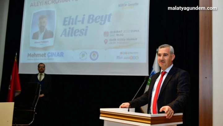Panelin açılış konuşmasına İslam Dini ve Türk Medeniyetinin temelinde aile kültürü olduğunu ifade ederek başlayan Yeşilyurt Belediye Başkanı Mehmet Çınar, “ Eğitim Bir-Sen Malatya Şube Başkanlığımızla işbirliği haline düzenlediğimiz ‘Aileyi Korumak Fethimizdir' Projesi kapsamında yine önemli bir kültürel hizmeti gerçeğe dönüştürmüş oluyoruz. Ailenin temel dinamiklerini korumak, aile bireyleri arasında saygı, sevgi, yardımlaşma ve paylaşmayı güçlendirmeyi temel hedef alan bu projemiz kapsamında düzenlediğimiz kültürel ve sanatsal etkinliklerimize hemşerilerimiz yazar Ahmet Turgut'un konuşmacı olarak katıldığı ‘Ehli Beyt Ailesi' panelimizle devam ediyoruz. Müslümanlığın ve kadim medeniyetimizin sağlam ve güçlü temellere sahip olmasında aile kültürünün çok önemli bir yeri vardır. Aileyi kaybedersek, toplumsal dinamiklerimizin tamamını kaybederiz. Bir milleti ayakta tutan sağlam ve güçlü aile yapısıdır “ dedi.