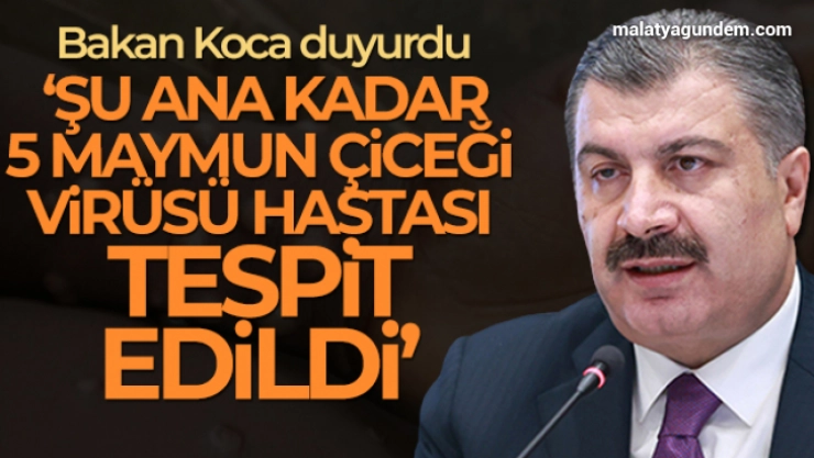 Sağlık Bakanı Fahrettin Koca, "Şu ana kadar ülkemizde 5 maymun çiçeği virüsü hastası tespit edildi. Bu 5 hastaya filyasyon yapıldı ve yakın çevresi izole edildi. 4 hastamız tamamen iyileşti ve taburcu edildi. 1 hastamız ise izolasyonda" dedi.