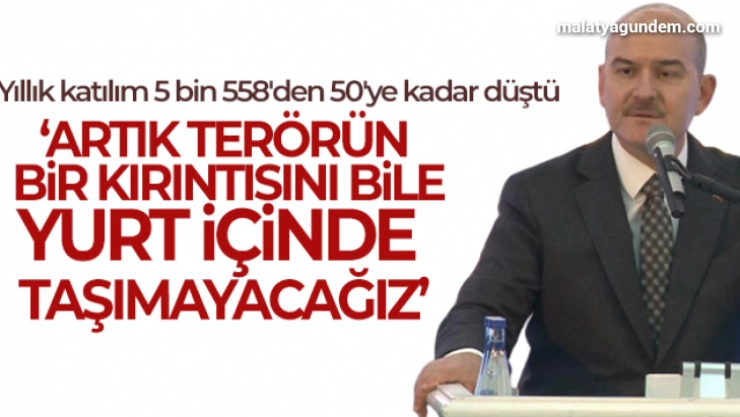 İçişleri Bakanı Süleyman Soylu, terör örgütüne katılımın yılda 5 bin 558'den 50'ye kadar düştüğünü belirterek, 'Artık terörün bir kırıntısını bile yurt içinde taşımayacağız. Altını kaldırmadık taş, aramadık, ayağımızı basmadığımız bir santimetrekare bile bırakmayacağız' dedi.