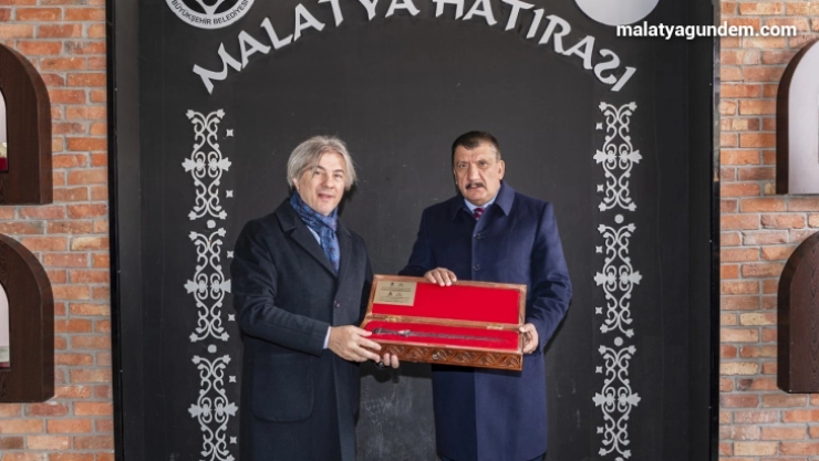 Malatya Büyükşehir Belediye Başkanı Selahattin Gürkan Kültür ve Turizm Bakan Yardımcısı Demircan’a ziyaretlerinin anısına Kayısı ve Arslantepe’de imal edilen tarihin en eski kılıcının replikasını taktim etti.