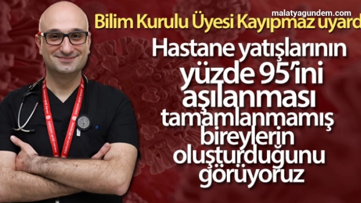 Sağlık Bakanlığı Koronavirüs Bilim Kurulu Üyesi Doç. Dr. Afşin Emre Kayıpmaz, 'Kendi hastanemize baktığımızda Ankara Şehir Hastanesi'nde Acil Tıp Kliniğinden yoğun bakıma yatırılan Covid-19 olgularında büyük bir çoğunluğu aşılanmamış bireyler oluşturuyor. Hemen ardından ise aşılanması tamamlanmamış bireyler geliyor. Ülke geneline baktığımızda da zaten hastane yatışlarının yüzde 95'ini aşılanması tamamlanmamış bireylerin oluşturduğunu görüyoruz' dedi.