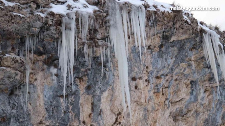 Malatya'nın Akçadağ ilçesinde bin 400 metre rakımdaki eriyen kar suların oluşturduğu şelale ve buz sarkıtlar, ziyaretçilerine görsel şölen sunuyor.