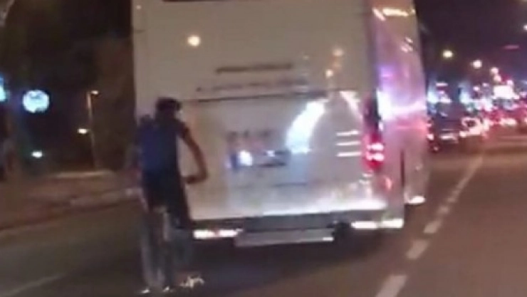 Malatya'da bir bisiklet sürücüsünün çevreyolunda yolcu otobüsünün arkasına tutunarak ilerlediği tehlikeli yolculuk bir vatandaşın cep telefonu kamerasına yansıdı.