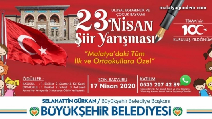 Malatya Büyükşehir Belediyesi tarafından Türkiye Büyük Millet Meclisi'nin (TBMM) kuruluşunun 100'ncü yıldönümü ve 23 Nisan Ulusal Egemenlik ve Çocuk Bayramı dolayısıyla şiir yarışması düzenleniyor.