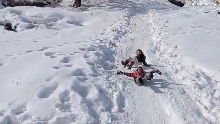 Yazıhan ilçesinde kar kalınlığının yer yer yarım metreyi bulmasıyla birlikte ilçeye bağlı Böğürtlen Mahallesi’nde karı fırsata çeviren çocuklar, soğuk havaya aldırış etmeden tepsi ve bidon gibi buldukları malzemelerle kayarak doyasıya eğlendi.