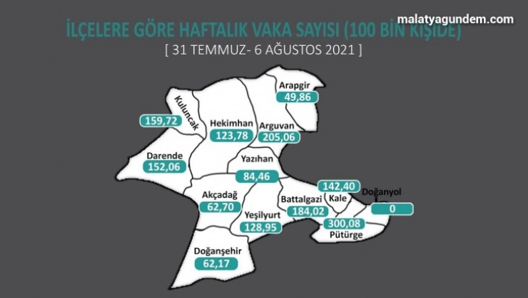 Sağlık Bakanlığı’nın yayımladığı 31 Temmuz ile 6 Ağustos 2021 tarihleri arasında haftalık vaka sayılarına göre, Malatya’nın Doğanyol İlçesi’nde vaka sayısı sıfır olarak görüldü. Doğanyol’un komşu ilçesi Pütürge’de ise 300,08 ile ilçelerin rekoru kırıldı. Pütürge’yi 205,06 ile Arguvan ve 184,02 ile Battalgazi takip etti.