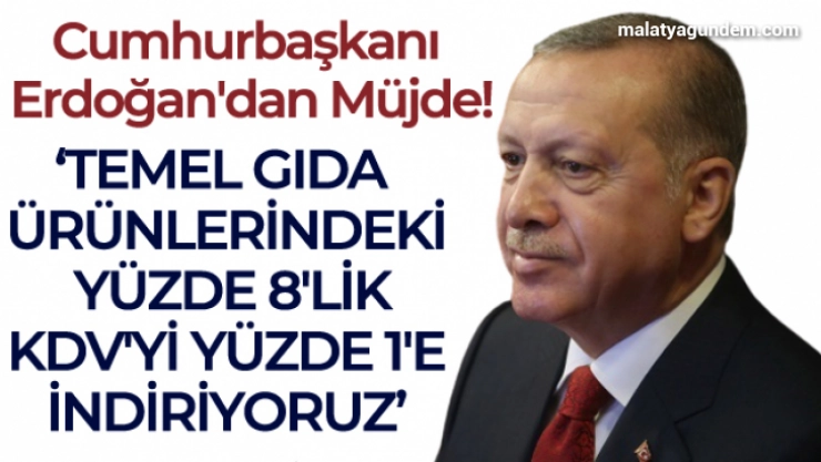Bugün bu adımlarından birinin müjdesini sizlerle ve milletimizle paylamak üzere bir aradayız. Temel gıda ürünlerinde yüzde 8 olan KDV'yi yüzde 1'e indiyoruz. Devlet adına yüzde 7'Lik bir indirim yapmış oluyoruz.
