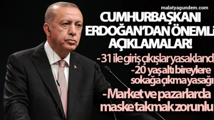 Cumhurbaşkanı Recep Tayyip Erdoğan, “Bu gece itibariyle ülkemizin 30 büyükşehri ile akciğer rahatsızlıklarının sık görüldüğü Zonguldak ilimizi belirli istisnalar haricinde araç giriş çıkışına kapatıyoruz. Ülkemizin tamamında daha önce 65 yaş üzeri uyguladığımız sokağa çıkma yasağını 20 yaş altına da getirdik. Gece yarısından itibaren 1 Ocak 2000 ve üstü doğumlular sokağa çıkamayacaktır” dedi.