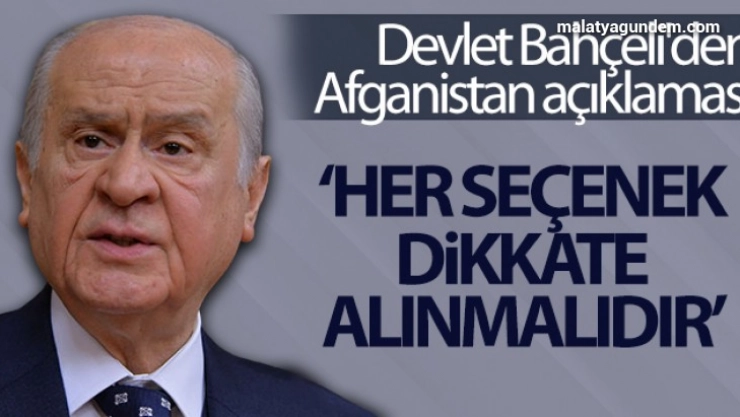 MHP Genel Başkanı Devlet Baçeli Afganistan'daki gelişmeler üzerine açıklamalarda bulundu. Bahçeli, 'Taliban ile görüşmek dahil her seçenek dikkate alınmalıdır.' ifadelerini kullandı.