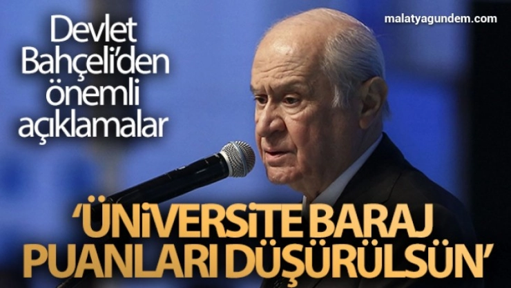 Milliyetçi Hareket Partisi (MHP) Genel Başkanı Devlet Bahçeli, 'Salgın dönemi göz önüne alınarak TYT baraj puanın 140'a, AYT baraj puanın da 160'a çekilmesi teklif ve temennimizdir. Üniversiteye girmek için mücadele eden, ama salgın gibi mücbir ve zecri hallerden dolayı hedeflediği puanları elde edemeyen gençlerimize sahip çıkalım' dedi.