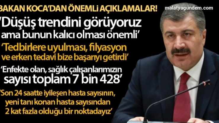 Günlük açıklanan Koronavirüs Tablosu'nda her geçen gün daha iyi gidildiğine değinen Koca, tedbiri elden bırakmamak gerektiğini söyledi. Koca, “Son 24 saatte iyileşen hasta sayısının, yeni tanı konan hasta sayısından artık iki kat fazla olduğu bir noktadayız. Covid-19 salgınına karşı şu ana kadar kazandığımız başarıyı 3 faktör sağlamıştır. Bu faktörlerden ilki sizsiniz. Bu faktörlerden ikincisi; hastalarla temas etmiş kişilerin taranmasıdır. Üçüncüsü; tedaviye olabildiğince erken başlamamızdır. Salgının başlangıcında Türkiye virüsün ülkeye girişini geciktiren az sayıda ülkeden biri olmuştur. Cumhurbaşkanımızın liderliğinde siyasi irade, tam bir koordinasyon içinde tedbirlere destek verdi. Güçlü sağlık sistemimiz ve fedakar sağlık personelimiz bu süreçte güçlü dayanağımız oldu. 5'inci haftada hastalığın seyri değişti. Unutmamalıyız; 11 Mart'tan bugüne geldiğimiz nokta kesin başarı noktası değildir. Önümüzdeki günler, eski günlerin aynısı olmayacaktır. Başarı, tedbirleri terk edeceğimiz bir başarı değildir. Tedbirlere sarılmamız gereken bir başarıdır. Aramızda hala virüsü taşıyan ve yeni tanı konan insanlar var. Hastalık bitmedi. Mücadele devam etmelidir. Elbette hayatta normale yaklaşarak devam edecektir. İnanıyoruz ki; her gün bir önceki günden daha iyi olacak” ifadelerini kullandı.