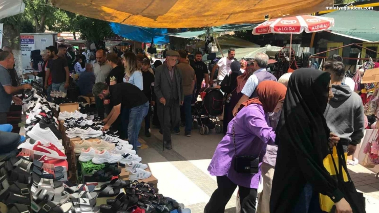 Deprem bölgesinde işyerleri yıkılan esnaflar kent merkezinde kurdukları tezgahlar ile bayram öncesi satışlarını sürdürüyor.