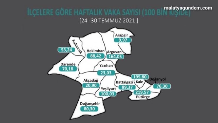 İlçelere göre son rakamlarda Pütürge 219,57 ile rekor kırdı. Pütürge’yi 195,80 ile Kale, 100,03 ile Yeşilyurt takip etti. En az korona ise 9,97 ile Arapgir ve 20,90 ile Akçadağ’da görüldü.