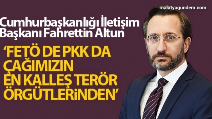 Cumhurbaşkanlığı İletişim Başkanı Fahrettin Altun ' Masum insanları kalleşçe öldüren katil örgütlere gösterilen 'engin hoşgörü' ne yazık ki modern zamanların en can acıtan sorunlarından biridir. Zira terör örgütleri, sadece hedef aldıkları kesim için değil, tüm dünya için tehdittir. ABD ve AB'nin terör listesindeki PKK'nın veya 15 Temmuz'da 251 masum insanı katleden FETÖ'nün elebaşıları, sosyal medya platformlarında serbestçe propaganda yapmaya devam ediyorlar' dedi.