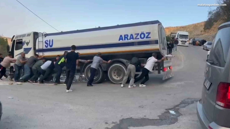 Malatya'nın Darende ilçesinde, Günpınar Şelalesi mevkiinde hatalı park edilen araçlar nedeniyle dönüş yapamayan bir arazöz, çevredeki vatandaşların yardımıyla kurtarıldı.