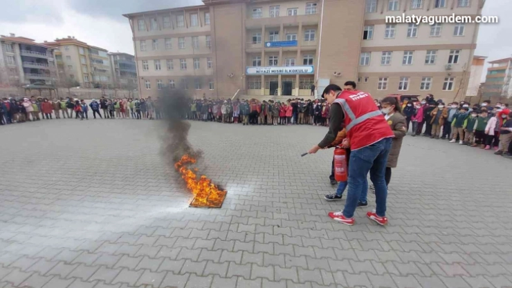 Malatya Büyükşehir Belediyesi İtfaiye ekipleri ilkokul öğrencilerine yönelik yangın tatbikatı düzenledi.