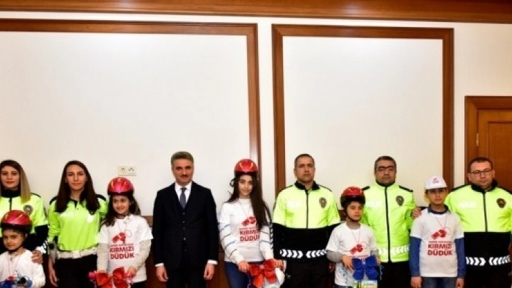 İl Emniyet Müdürü Ercan Dağdeviren ile Trafik Denetleme Şube Müdürünün da hazır bulunduğu programda Vali Baruş, öğrencileri tebrik ederek hediyelerini takdim etti.