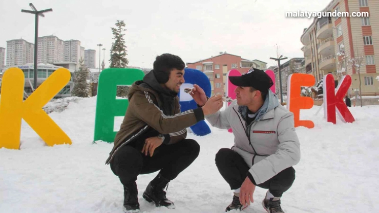 Malatya Kernek Meydanında gençler, karlı pekmezin tadına baktı. Evlerinden pekmez getirip karla karıştırıp yiyen gençler, bir yandan da karın tadını çıkardı.