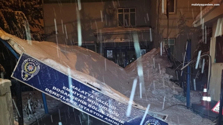 Malatya’da kar kütlesinin ağırlığına dayanamayan Sürgü Bölge Trafik Denetleme İstasyon Amirliği’nin sundurması çöktü.