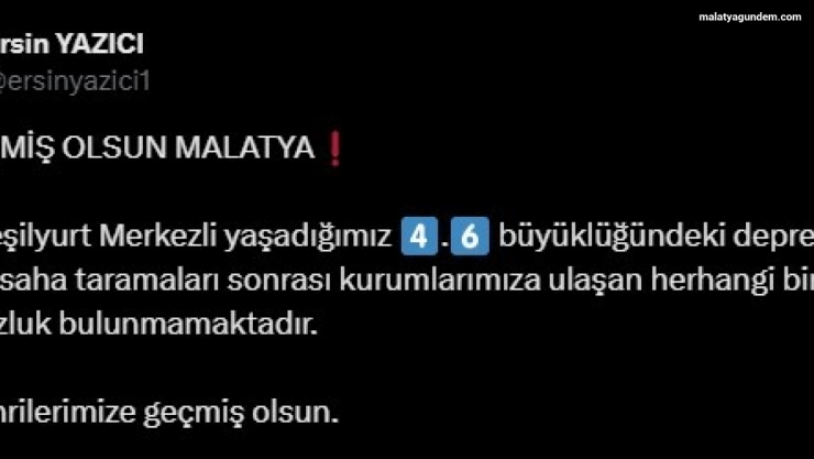 Malatya Valisi Ersin Yazıcı, saha tarama çalışmaları sonucu olumsuz bir duruma rastlanmadığını açıklayarak, "İlimiz Yeşilyurt merkezli yaşadığımız 4.6 büyüklüğündeki depremde yapılan saha taramaları sonrası kurumlarımıza ulaşan herhangi bir olumsuzluk bulunmamaktadır. Hemşerilerimize geçmiş olsun" ifadelerini kullandı.