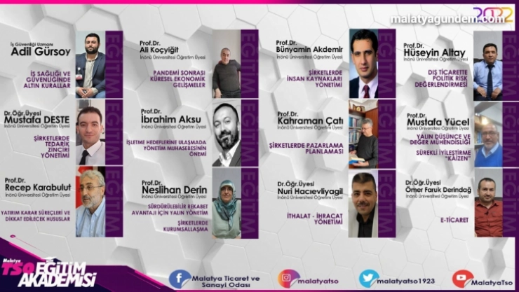 MTSO’nun üyelerine sunulan eğitim ve bilgilendirme hizmetlerinin tek çatı altında yönetilmesi amacıyla oluşturulan ’Malatya TSO Eğitim Akademisi’ ilk günden bu yana birçok verimli çalışmaya imza attı. Korona virüs salgınıyla birlikte oluşan mesafeli sisteme ayak uyduran Malatya TSO Eğitim Akademisi, yüz yüze gerçekleştirdiği çalışmalarına farklı bir boyut kazandırdı. Oluşturduğu stüdyosunda, en yeni teknolojik cihazları kullanarak çekimler yapan akademi, eğitim videolarını dijital platformlar aracılığıyla üyelerinin ve tüm kamuoyunun bilgisine sunuyor. Pandeminin başladığı ilk günden bu yana birbirinden değerli akademisyenleri ağırlayan akademi 2022 yılında da TSO üyelerinin yeniliklerden haberdar olması, finansal, yönetimsel, koordinasyon sorunlarının iyileştirilmesi ve dijital dönüşüme ayak uydurabilmeleri için alanında uzman konukları ağırlamaya devam edecek.