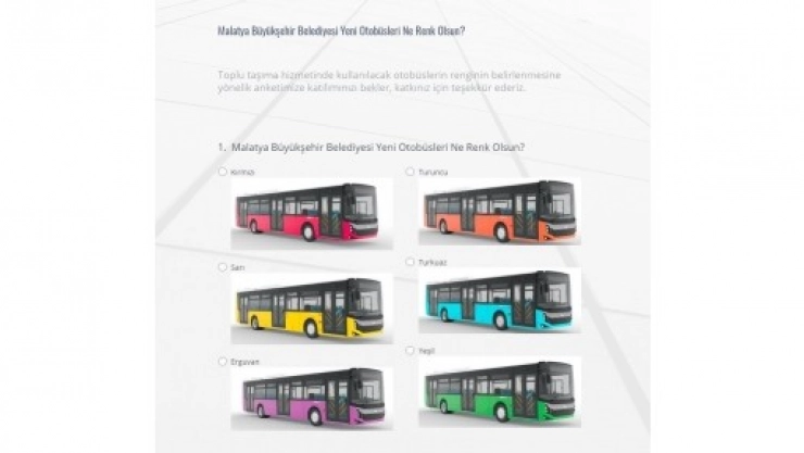 Malatyalılar, toplu taşımada hangi renk otobüs görmek istediklerini Büyükşehir Belediyesinin www.malatya.bel.tr isimli web sitesinde düzenlenen “yeni belediye otobüslerimizin hangi renk olmasını istersiniz’ sütununda yer alan ankete katılarak belirleyebilecekler.