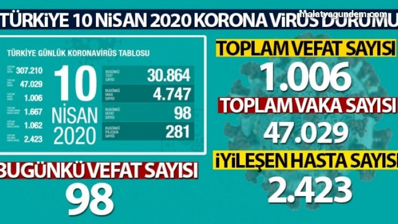 - “Toplam test sayısı 307 bin 210 oldu. Bugün 30 bin 864 test yaptık. 4 bin 747 vaka, 98 kişi vefat etti. Toplam vefat sayımız bin 6 oldu. Bu gün toplam 2 bin 423 hastamız iyileşti.”
