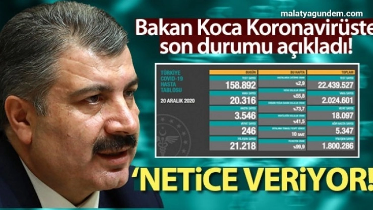 Tabloya göre son 24 saatte 246 kişi korona virüsten hayatını kaybetti, toplam can kaybı 18 bin 97'e yükseldi. Bugün toplam 158 bin 892 test yapılırken, 20 bin 316 yeni vaka sayısı, 3 bin 546 kişi de yeni hasta sayısı oldu. Toplam vaka sayısının 2 milyon 24 bin 601 olduğu, bugün iyileşen 21 bin 218 kişiyle birlikte toplam iyileşen hasta sayısının 1 milyon 800 bin 286'ya yükseldiği, toplam hastalarda zatürre oranının yüzde 2,9, toplam ağır hasta sayısının ise 5 bin 347 olduğu açıklandı.