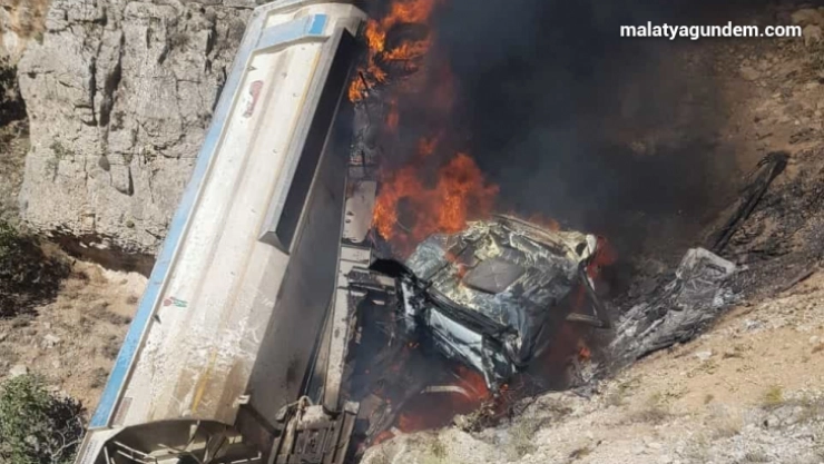 Malatya'nın Akçadağ ilçesinde sürücüsünün kontrolünden çıkan kamyon 50 metrelik uçuruma yuvarlandı. Kazada alev alan aracın sürücüsü yaralandı.