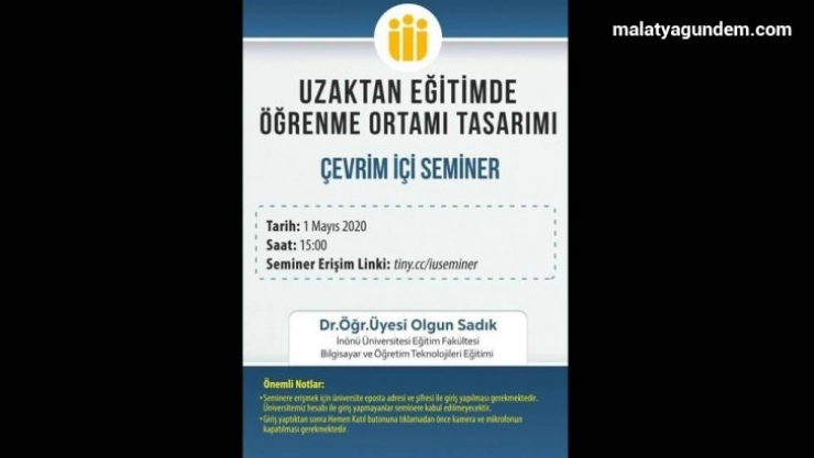 Malatya İnönü Üniversitesi'nde uzaktan eğitim mesleki gelişim çalışmaları kapsamında 'Uzaktan eğitimde öğrenme ortamı tasarımı' başlıklı bir çevrimiçi seminer verilecek.